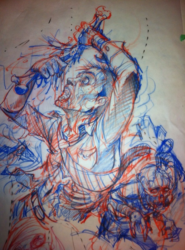 This a good example of how to start a week. Wake up, drink a pot of coffee, burn off a 10 minute sketch, and be tattooing it by 11:00. Today I'm starting a whole side on a girl of zombies, this is going to be her rib, hip and ass area. Unfortunately she has a billon coverups to take care of. So for something like this I like to figure it out as I go along, but I still have a main plan.